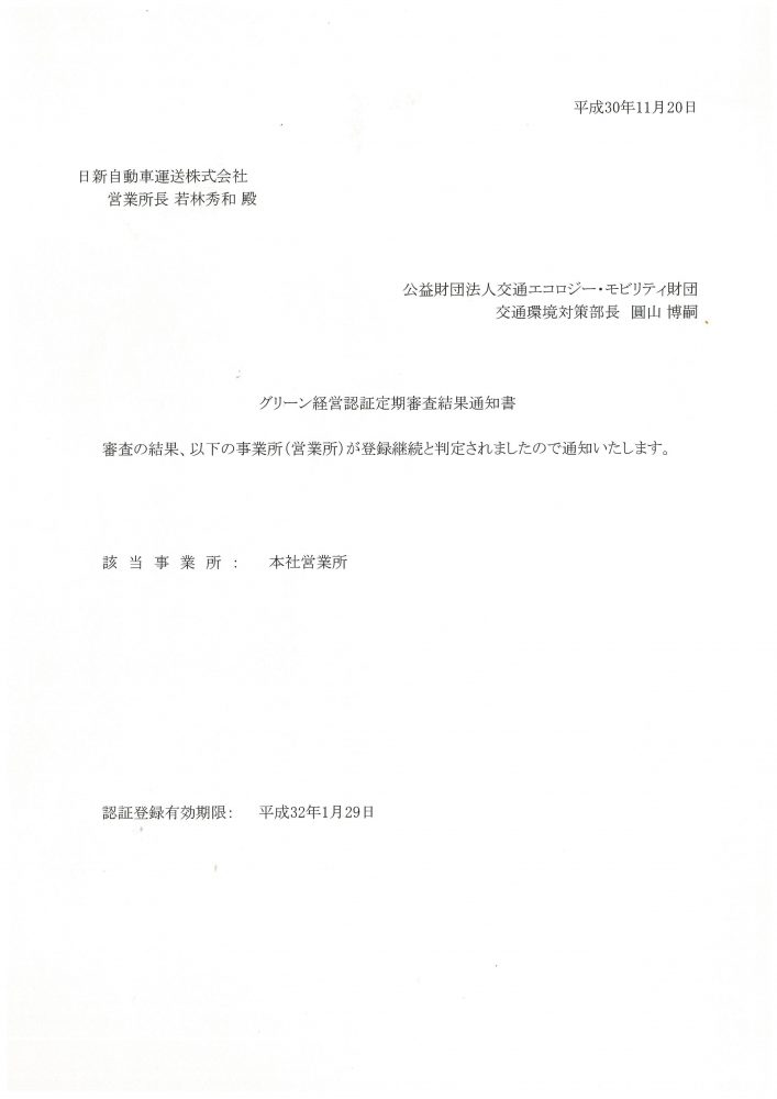 2018年(平成30年)11月20日付でグリーン経営定期審査結果が郵送されて参りました。登録審査は2年毎に行われますが、当社は昨年更新されていますので今年は中間定期審査の年に当たります。 もちろん、綿密な資料を提出しました結果、11月20日付で登録継続の判定をいただきました。 私たち運送会社にとっては、Gマーク「安全性優良事業所」の認定と、この「グリーン経営」の登録は車の両輪みたいなものです。どちらかが脱輪しますと、それだけで車は前に進みません。 これからも、環境対策、安全対策を重視して堅実に経営に当たります。