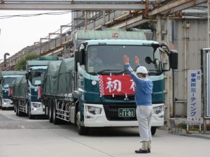 毎年仕事始めの恒例行事として初荷式を挙行してまいりましたが、2020年を最後に新型コロナウイルス等により中止してまいりました。本年6年ぶりに新年初荷式を挙行し、多くの荷主様、協力会社様、社員等ご参列していただき盛大に万歳三唱の後、拍手もって初荷トラックを見送り出発しました。今年一年社業発展、交通安全そして皆様のご健勝を祈念し終了しました。