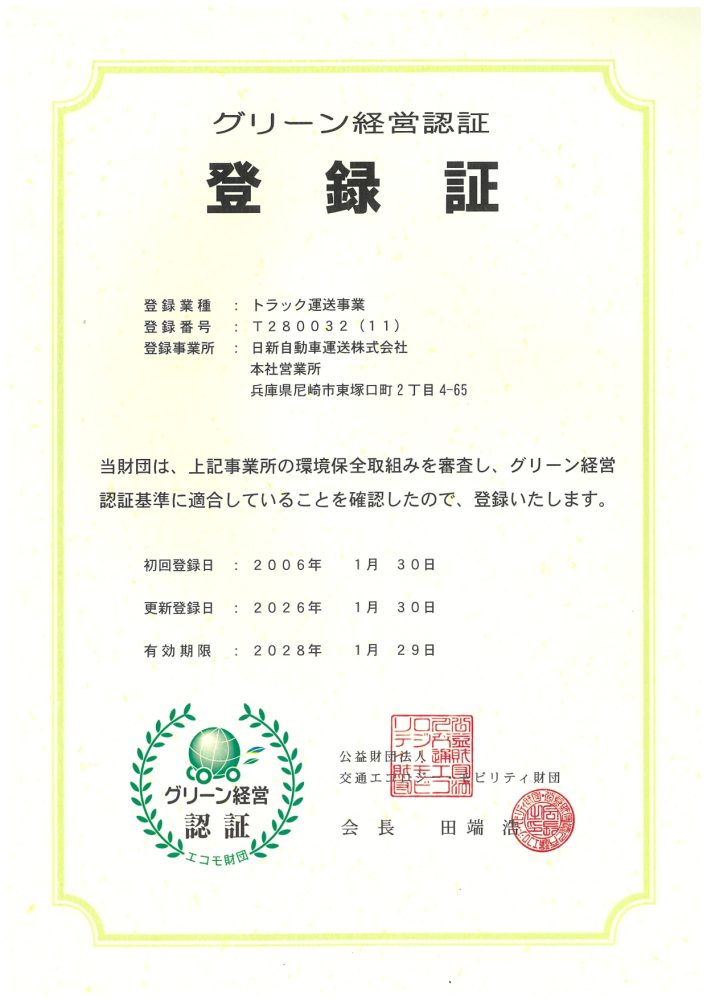 2026年(令和8年)2月3日(火)にグリーン経営認証登録証が郵送されてまいりました。