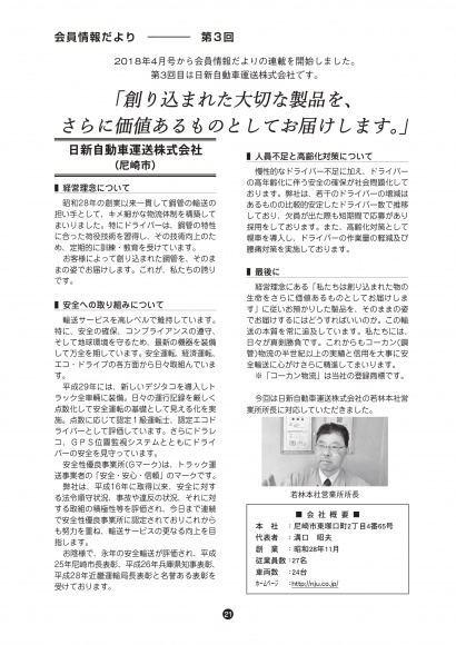 2018年6月号の会員情報だより第3回に当社が選ばれ掲載されました。当社の経営理念、安全への取り組み、人員不足と高齢化対策等本社営業所長の若林が回答しました。これを読めば当社の会社概況がすぐに解ります。掲載いただきました兵庫県トラック協会様ありがとうございます。