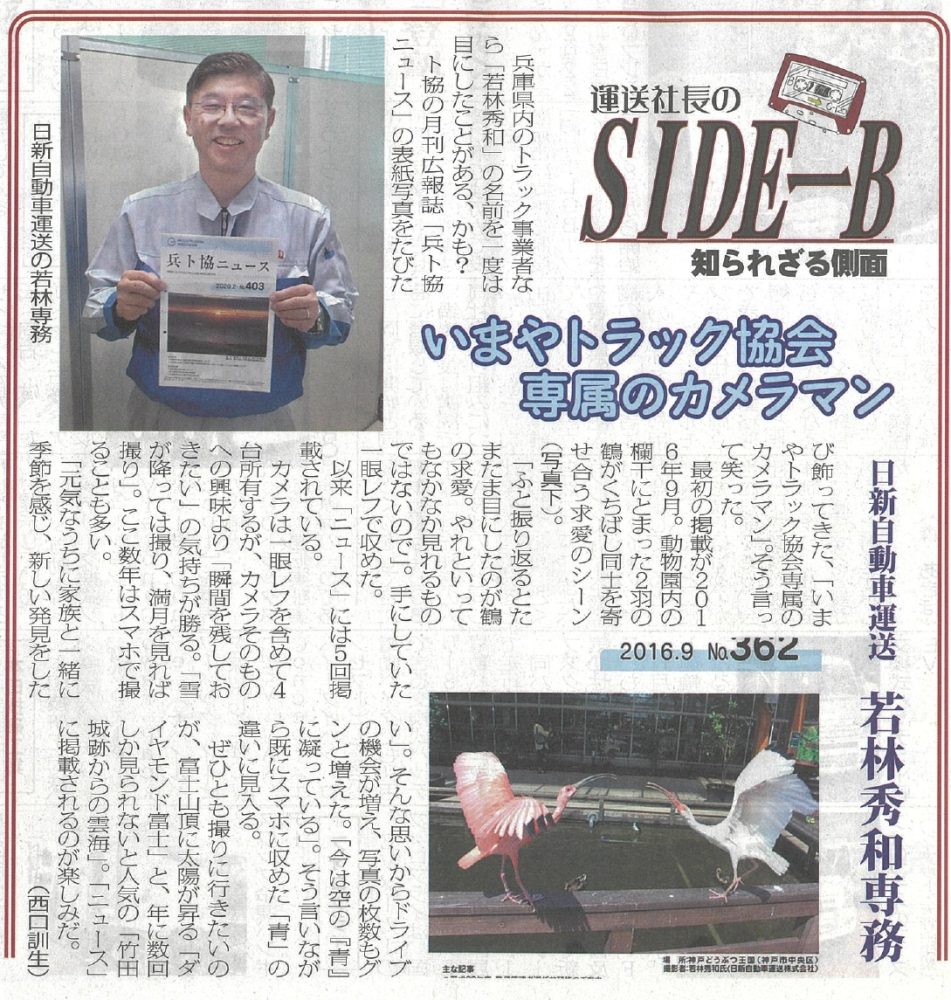 写真撮影が趣味の若林専務が兵庫県トラック協会のニュースの表紙に過去に何度も掲載されたことがあることから、今回は物流Weeklyの記者の目に留まり記事が掲載されました。掲載記事を読んでいくうちにお恥ずかしい気持ちになりましたが思い出になりました。