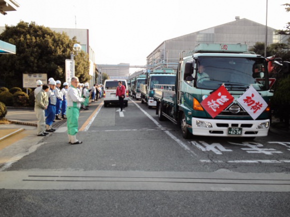 多くの社員の皆様や協力会社の方々に、拍手で見送られ出発する晴れやかさを体験することは、プロドライバーとしての意気の発揚にも繋がっているようです。私も、荷主様を支えて行かなければならない、という重圧をひしひしと感じるセレモニーでもあります。