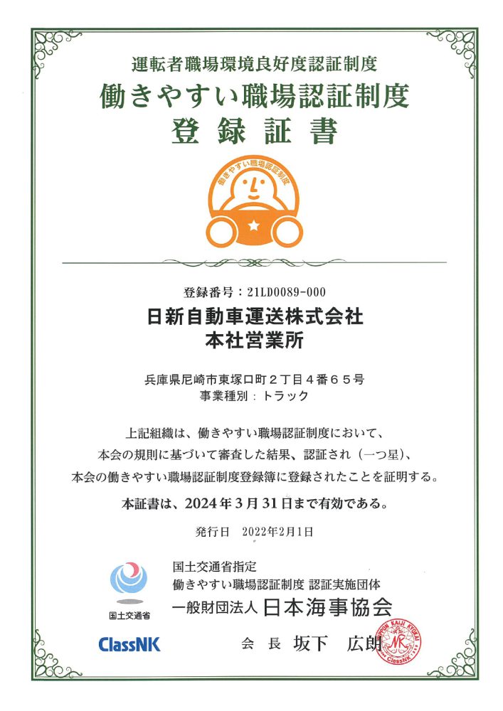 この「働きやすい職場認証制度」とは、 職場環境改善に向けたトラック、バス、タクシー事業者の取組みを「見える化」することで求職者の運転者への就職を促進し、各事業者の人材確保の取組みを後押しすることを目的とした制度です。